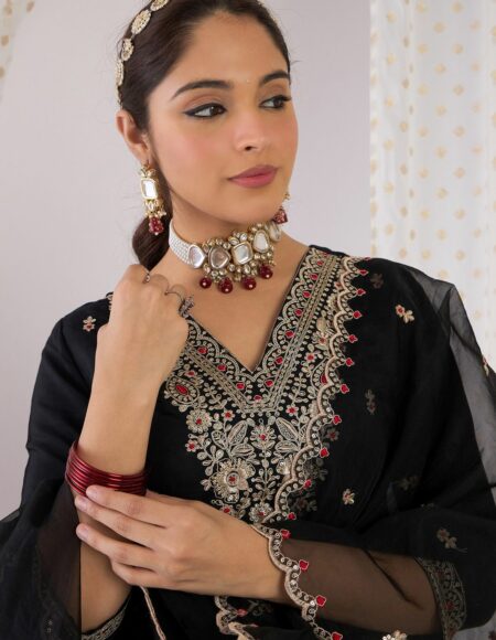 Step into elegance with this black silk blend kurta set, featuring intricate thread and sequin embroidery. Paired with tapered pants and a sheer embroidered.