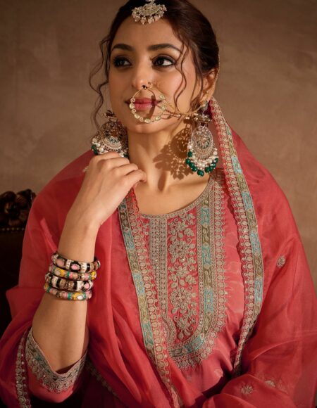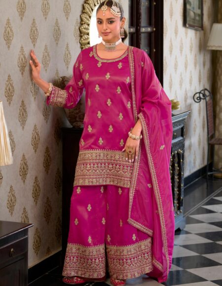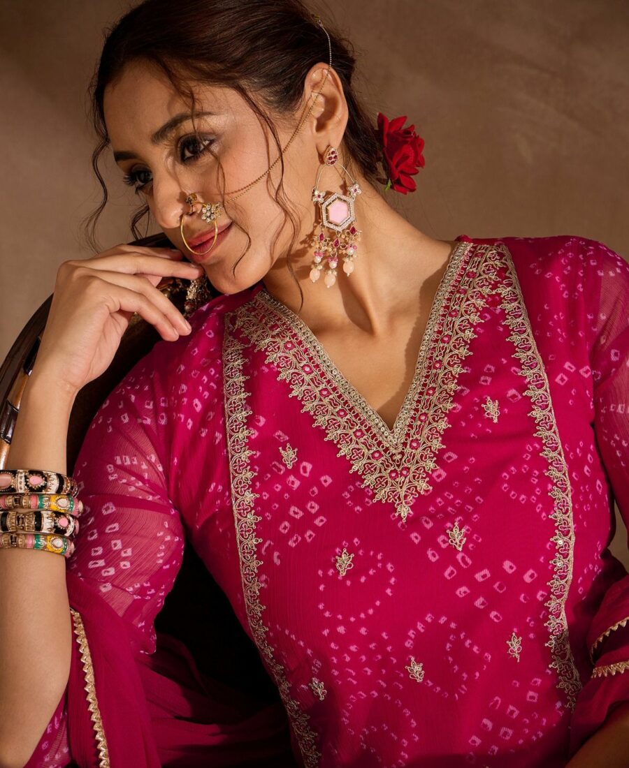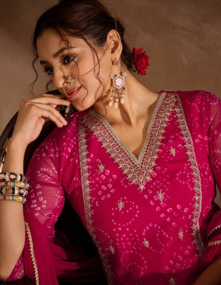 Celebrate Karwa Chauth in style with this tangy Rani Pink embroidered dhoti salwar kameez, blending tradition with contemporary elegance.
