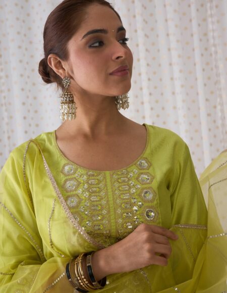 Brighten your festive look with this elegant lime silk blend kurta set, adorned with delicate embroidery and paired with matching trousers and a sheer.