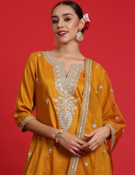 Brighten your festive look with this mustard yellow silk blend kurta set, adorned with rich silver thread embroidery and paired with a matching embroidered.