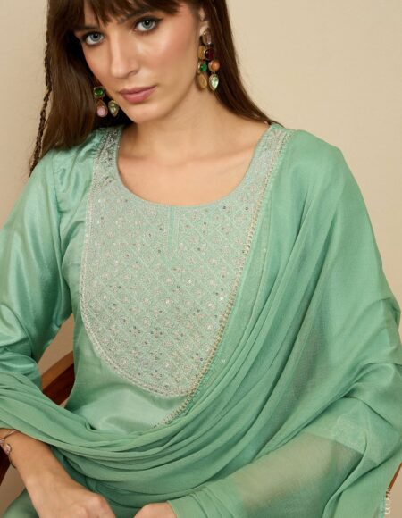 Leeza Sea Green Silk Blend Embroidered Kurta Trouser with Dupatta Set