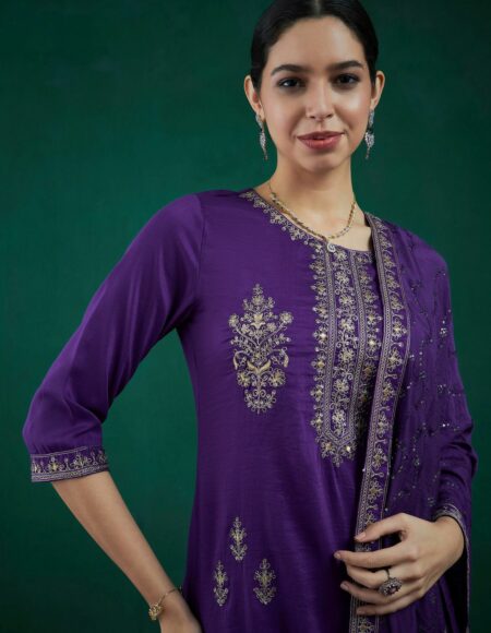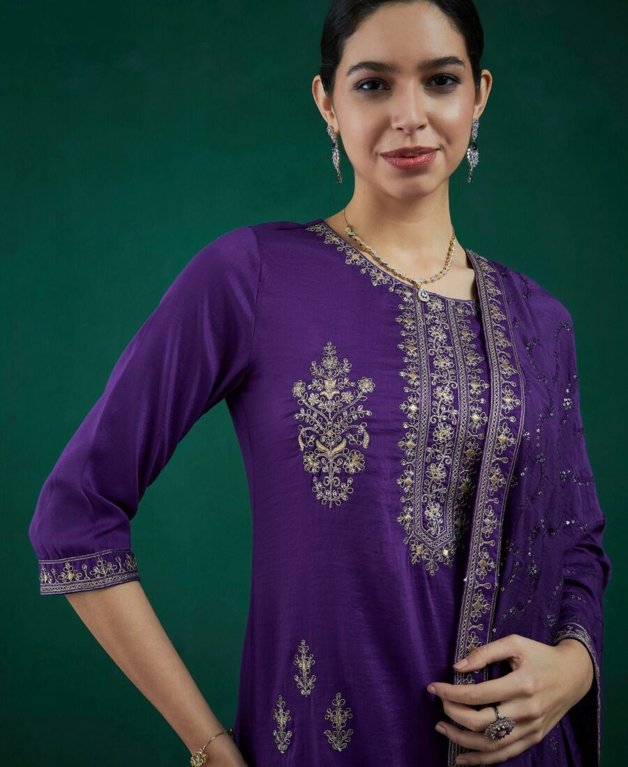 Leeza Purple Silk Blend Embroidered Kurta Trouser with Dupatta Set