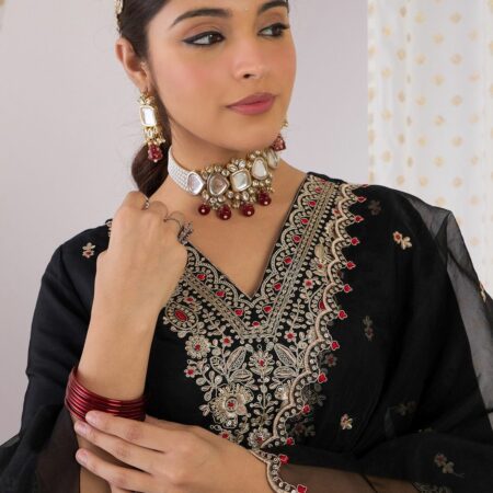 Step into elegance with this black silk blend kurta set, featuring intricate thread and sequin embroidery. Paired with tapered pants and a sheer embroidered.