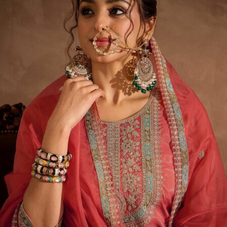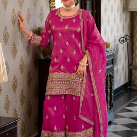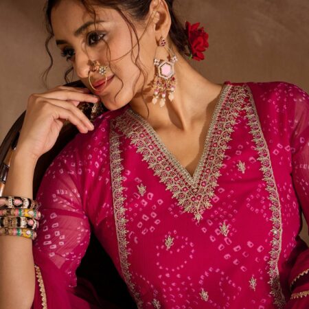 Celebrate Karwa Chauth in style with this tangy Rani Pink embroidered dhoti salwar kameez, blending tradition with contemporary elegance.