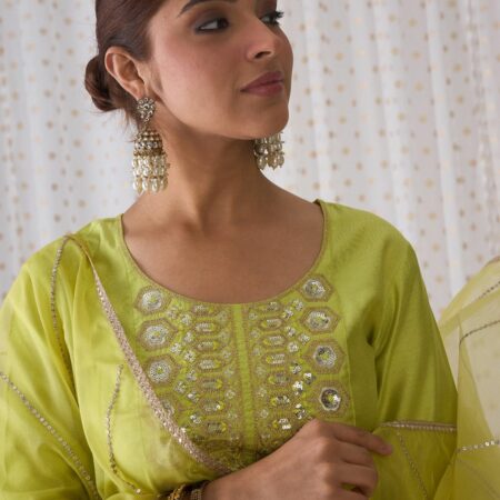 Brighten your festive look with this elegant lime silk blend kurta set, adorned with delicate embroidery and paired with matching trousers and a sheer.