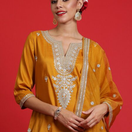 Brighten your festive look with this mustard yellow silk blend kurta set, adorned with rich silver thread embroidery and paired with a matching embroidered.