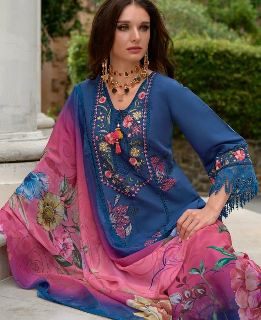 Floral Breeze by Leeza: Elegant Embroidered Blue Ensemble with Vibrant Floral Scarf