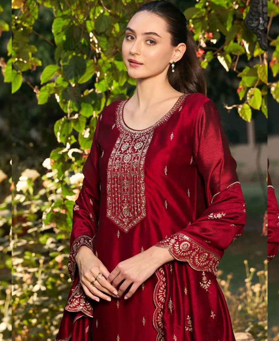 Leeza Embroidered Crimson Red Silk Kurta Set