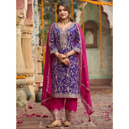 Leeza Purple Embroidered Silk Blend Kurta Trouser with Pink Dupatta