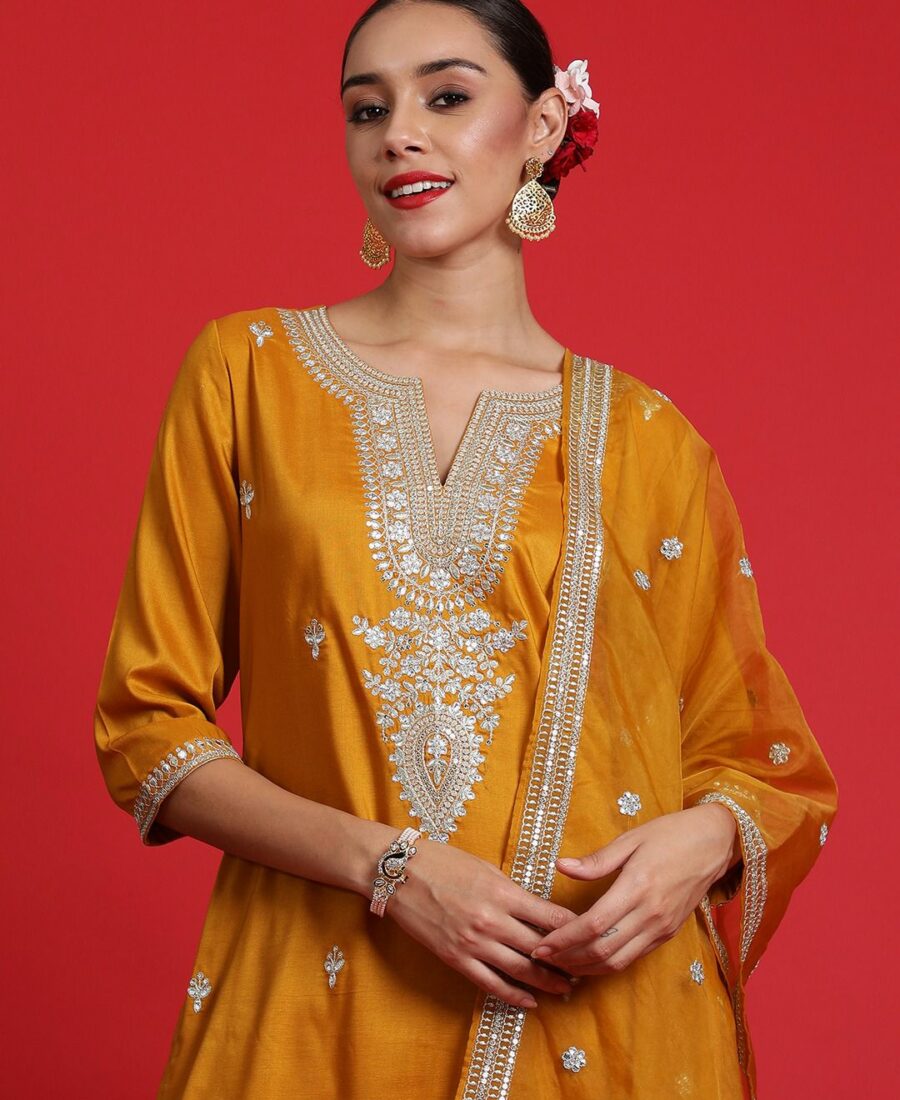Floral Embroidered Regular Sequinned Kurta With Trouser & Dupatta