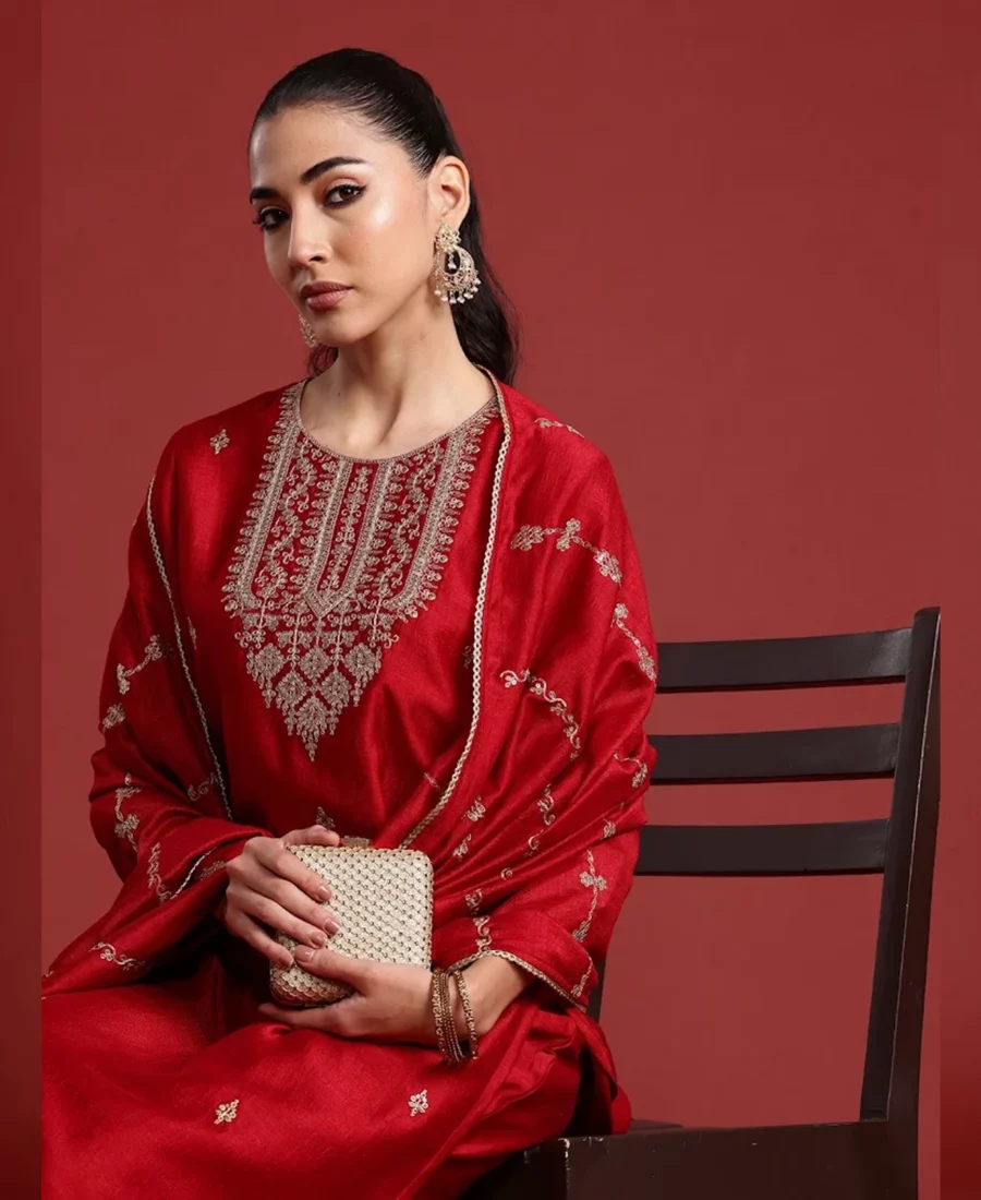 Leeza Embroidered Crimson Red Silk Kurta Set