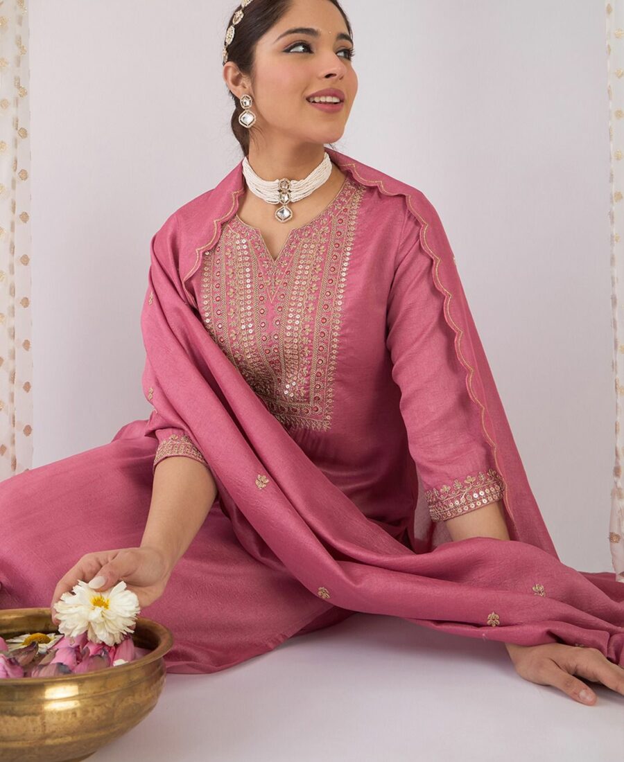 Leeza Elegant Rose Pink Embroidered Kurta Set