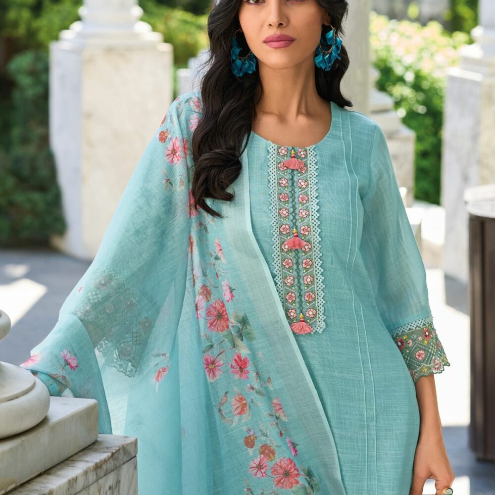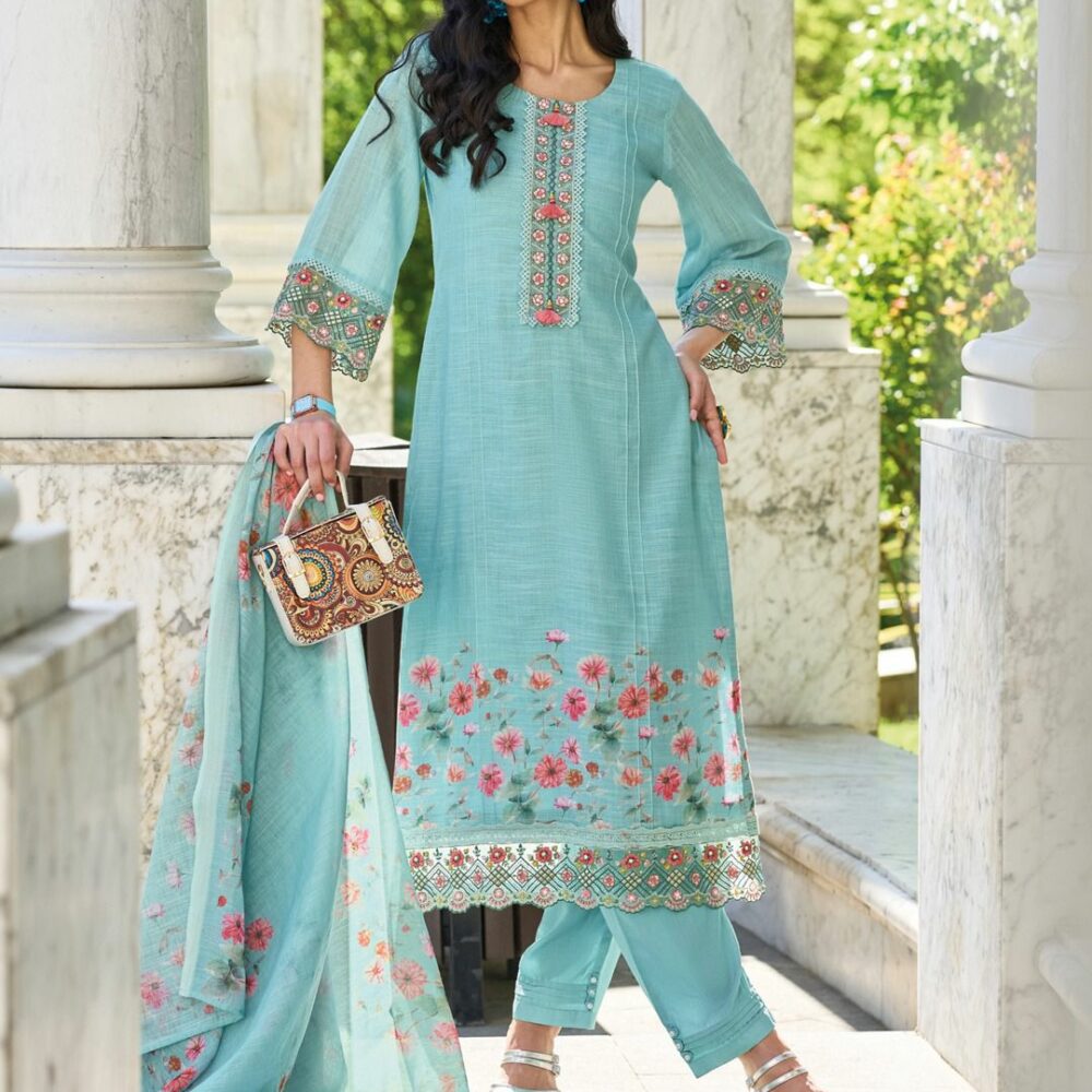 Refresh your ethnic wardrobe with the Leeza Aqua Blue Floral Embroidered Kurta Set, featuring delicate floral prints, fine embroidery, and a breezy dupatta for a graceful festive look.