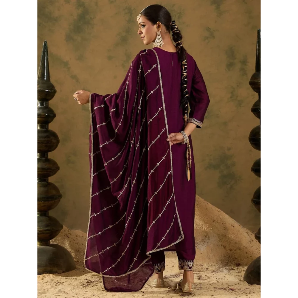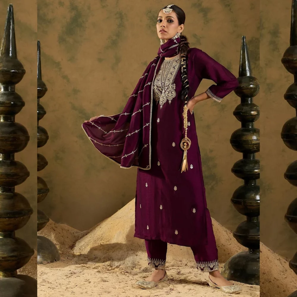 Elevate your ethnic wardrobe with this majestic plum silk kurta set, intricately adorned with zari and resham embroidery, and complemented by a beautifully bordered dupatta and embellished pants.
